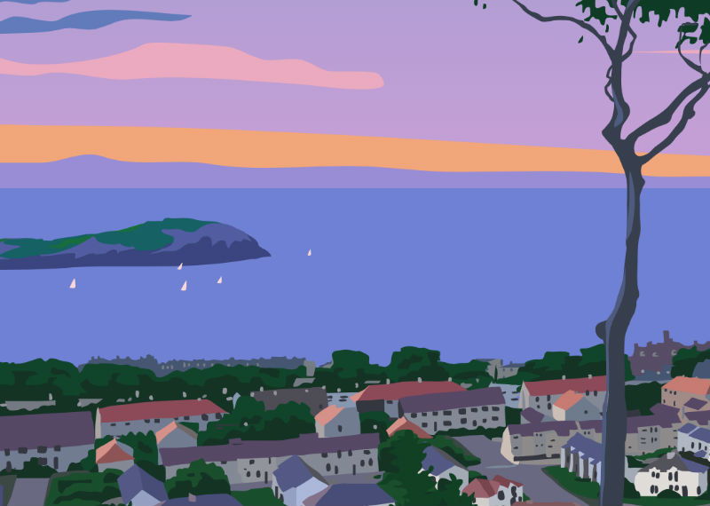 A colourful view from the eastern side of North Berwick Law on a clear morning, showing the islands of Craigleith and Bass Rock.